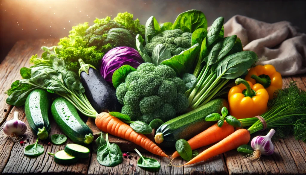 A vibrant assortment of fresh vegetables known for aiding digestion, including broccoli, spinach, carrots, and zucchini, displayed on a rustic wooden table with dewdrops emphasizing their freshness.