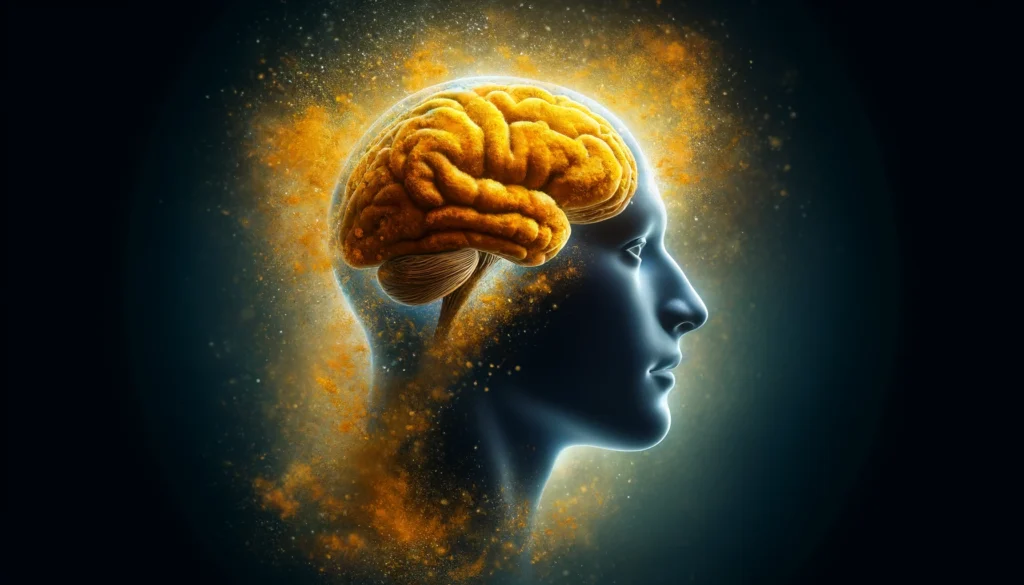 A human brain with golden turmeric particles swirling around, illustrating turmeric’s potential impact on mental health.