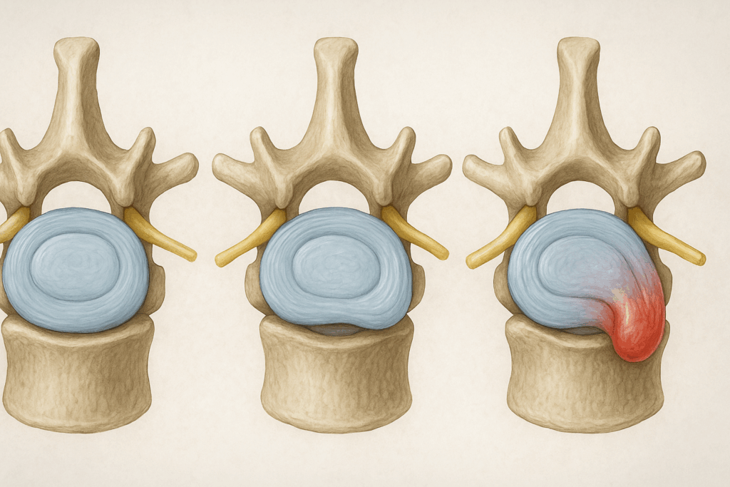In contrast, a bulging disc involves the outward protrusion of the disc without rupture. Although the nucleus pulposus remains contained, the disc may compress nearby neural structures. While sometimes asymptomatic, bulging discs can still cause pain and functional limitations, especially when they exert pressure on spinal nerves. These conditions may arise from age-related degeneration, trauma, poor posture, or repetitive strain, and they are frequently observed in the cervical and lumbar regions of the spine.