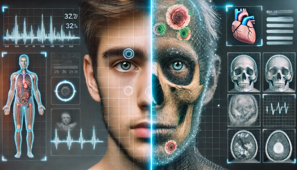 A split-image composition of a person's face transitioning from youthful and healthy to aged and deteriorating, with digital biometric markers and medical scan overlays highlighting internal health changes.