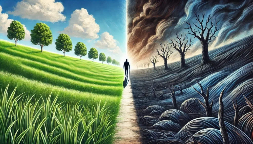 An artistic depiction of a person walking on a split path—one side lush and vibrant, the other dark and deteriorating—symbolizing how lifestyle choices influence biological aging and health risks.