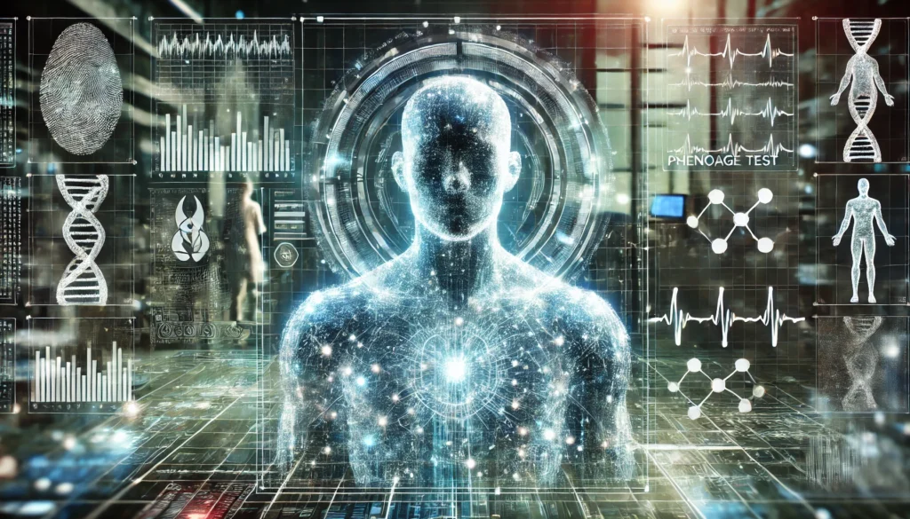 A futuristic representation of a human figure surrounded by digital health data streams and glowing biometric patterns. The background features a medical research environment, illustrating the PhenoAge test’s role in assessing biological aging and health risks.