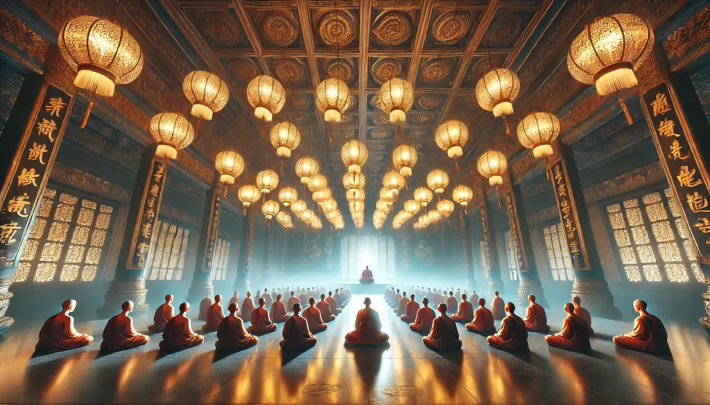 A grand spiritual meditation hall with monks meditating in harmony, illuminated by floating lanterns. The high-ceilinged space is adorned with intricate carvings and glowing sacred symbols, representing the unity of meditation, religion, and cognitive optimization.