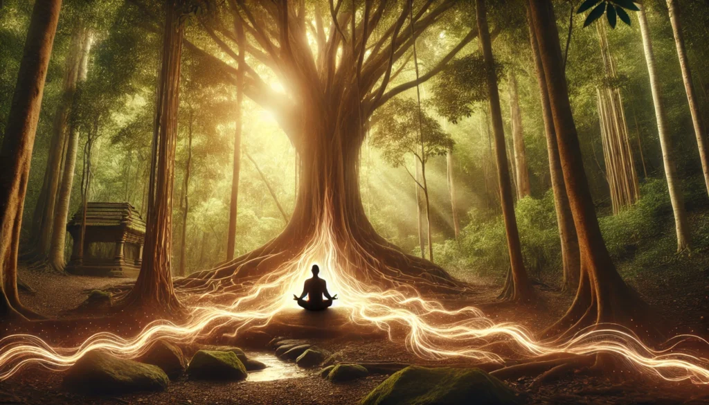 A peaceful meditation scene in a sacred forest, where a person sits cross-legged near an ancient tree with glowing roots. Golden light filters through the canopy, symbolizing spiritual growth, wisdom, and the cognitive benefits of deep meditation.