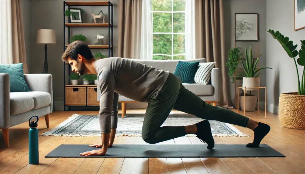 A man practicing the bird-dog exercise on a yoga mat in a cozy living room, extending one arm and the opposite leg to improve core stability and back strength. The room features a rug, indoor plants, and soft lighting.
