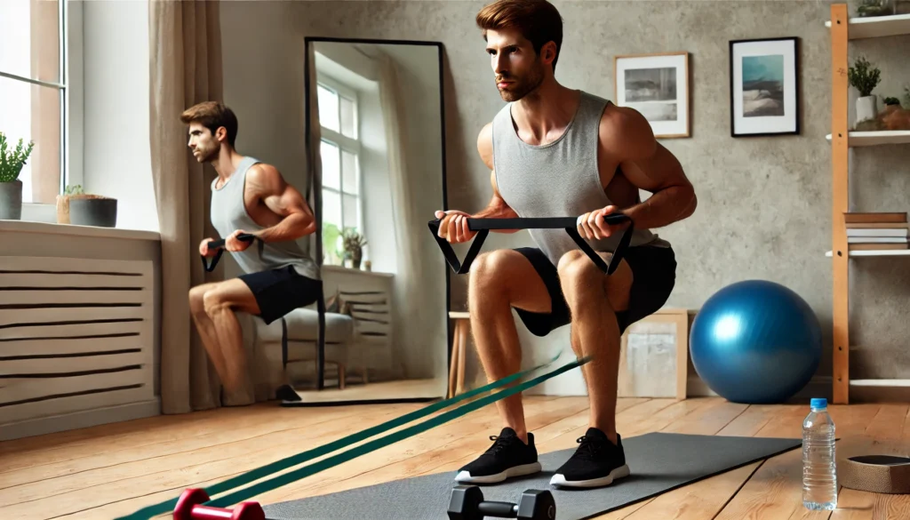 A fit man using a resistance band to perform a seated row exercise at home, pulling the band to strengthen his upper back. The room has a clean and bright atmosphere, featuring a yoga mat, small dumbbells, and a mirror reflecting his form.